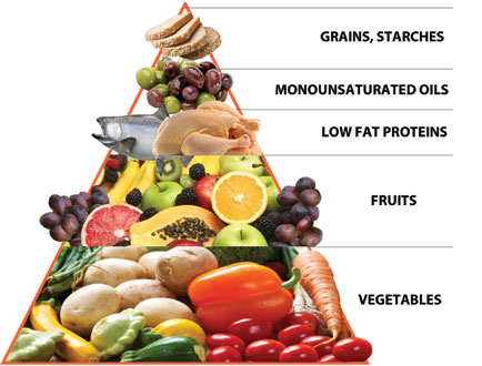 Chất đạm là thịt, cá, trứng, sữa, đậu. Nên chọn thực phẩm tươi ngon như thịt lợn, bò, gà mới giết mổ; cá, tôm, cua còn sống hoặc ướp lạnh thì hãy còn tươi. Chất đường chỉ nên ăn các loại ngũ cốc thô như gạo mới giã, mới xay xát, ngô, khoai, sắn, đậu mới thu hoạch còn tươi. Chất béo chỉ nên dùng dầu thực vật như dầu vừng, dầu hướng dương để chế biến món ăn. Đặc biệt rất nên ăn chất béo từ cá, cua, hải sản vì rất có lợi cho sức khỏe. Vitamin và khoáng chất có nhiều trong rau, củ quả tươi. Nên chọn mua các loại rau củ quả có màu sắc theo ngũ hành nói trên: xanh gồm các loại rau xanh, trái cây có vỏ màu xanh như cam, chanh, bưởi, bơ, ổi...; đỏ: rau dền, cà chua, gấc, ớt, quả đào, táo...; vàng: cà rốt, khoai lang nghệ, bí đỏ, cam chín, quýt, đu đủ, chuối...; trắng: nấm kim châm, giá đỗ, rau cần, hành tỏi, quả lê, dưa lê, củ đậu, quả roi (bồng bồng)...; đen: đậu đen, nấm hương, mộc nhĩ, cà tím, hạt tiêu, quả bồ quân, nho, măng cụt... Các loại rau củ quả trên đây đã bao gồm 5 vị chua, cay, mặn, đắng, ngọt rồi.